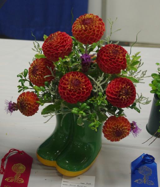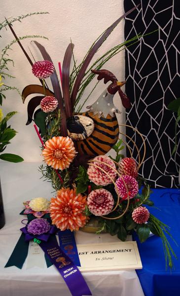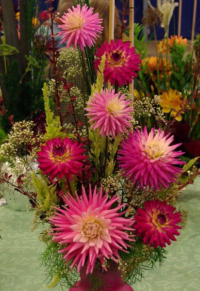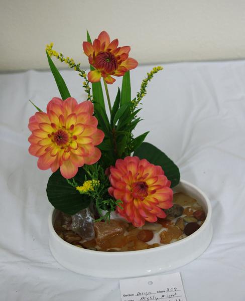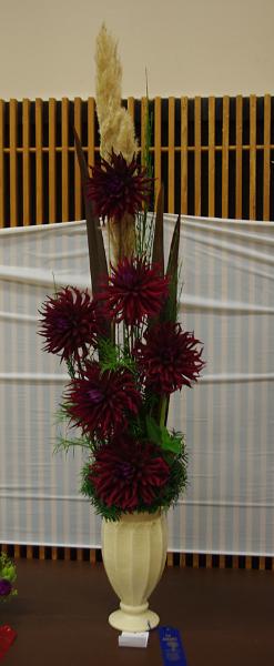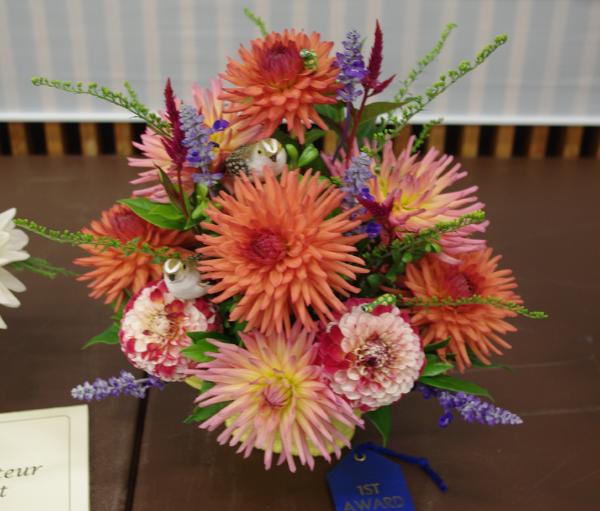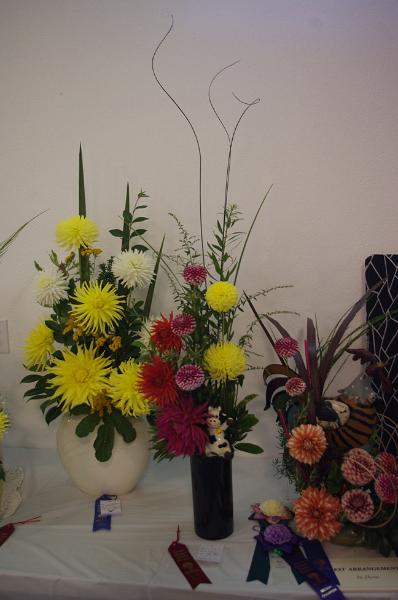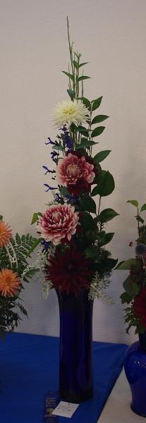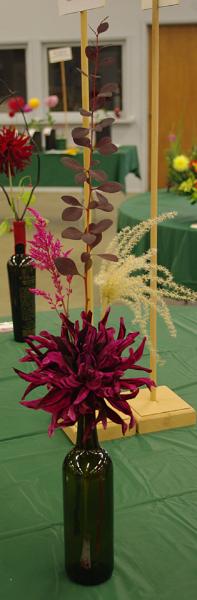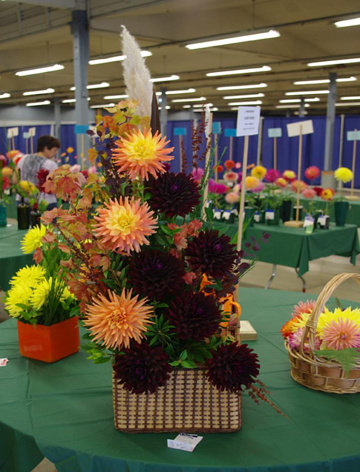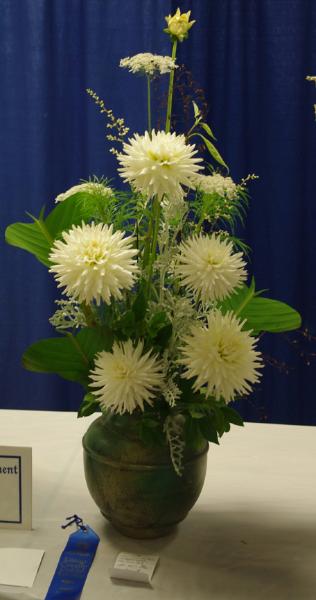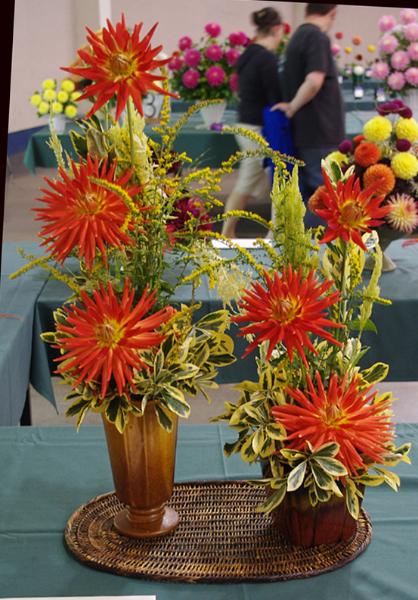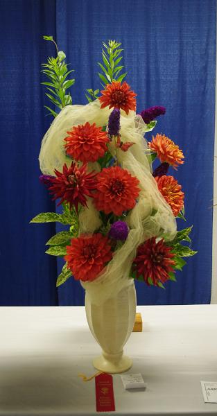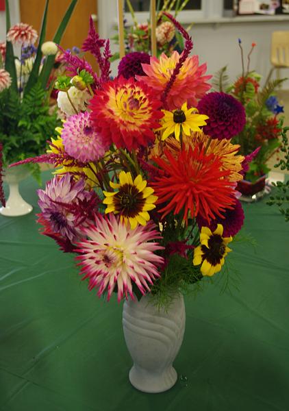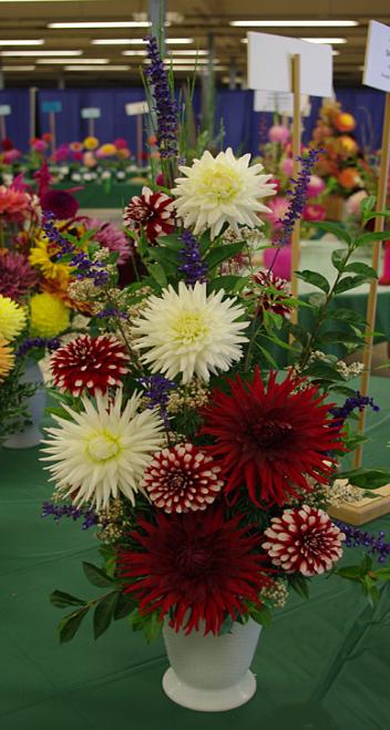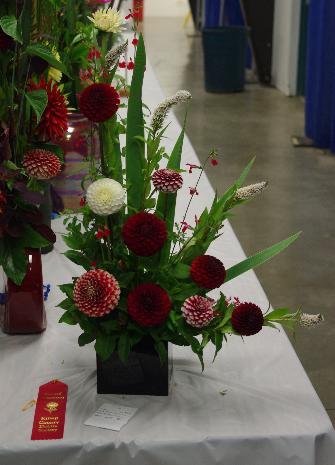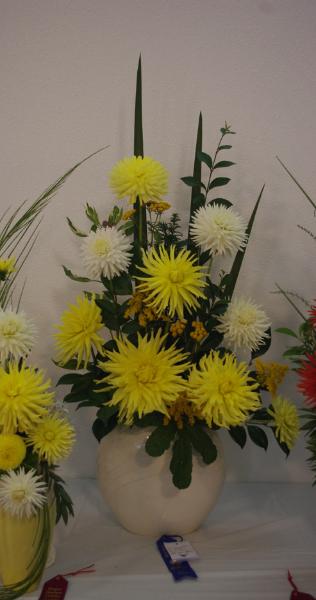 Margaret attended four dahlia shows this year. She tries to use our Hollyhill flowers and seedlings as much as possible in her designs. The designs that were entered in the American Dahlia Society National show are on a another web page, click here for that page.