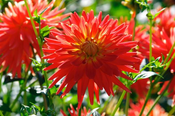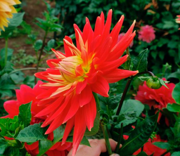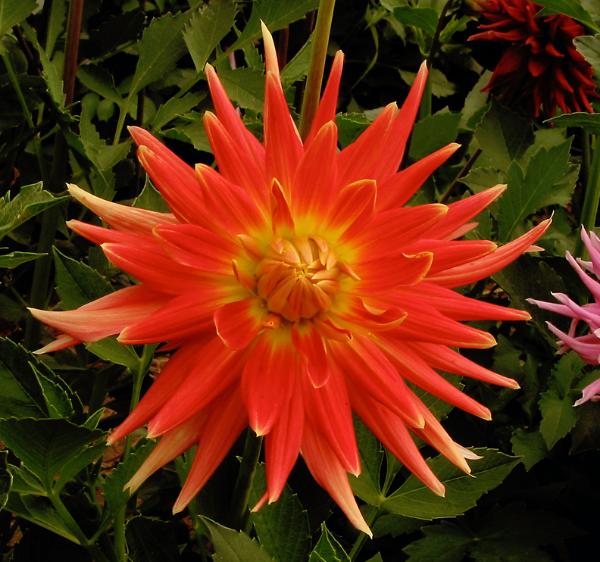 Art W. is named after Art Weurth of Olympia, Washington. He had the audacity of saying that he appreciated this flower when it was shown as a seedling. Art W. is a novelty flower that has the characteristics of a waterlily dahlia and a semi cactus dahlia. It is extremely flat with only about 7 rows of ray florets, just like a waterlily. However, instead of having flat petals with rounded tips like a waterlily, Art W. has classic semi cactus rolled petals. The flame colors are very deep and the flowers are about 7 inches in diameter. Art W. is an excellent cut flower and the florists love it . Grows on a vigorous bush; about 5 feet tall. Like Art W. the flower blooms a bit late. Pictures cannot show how bright the orange is. |