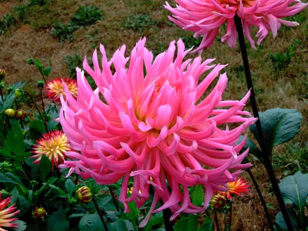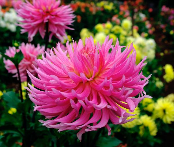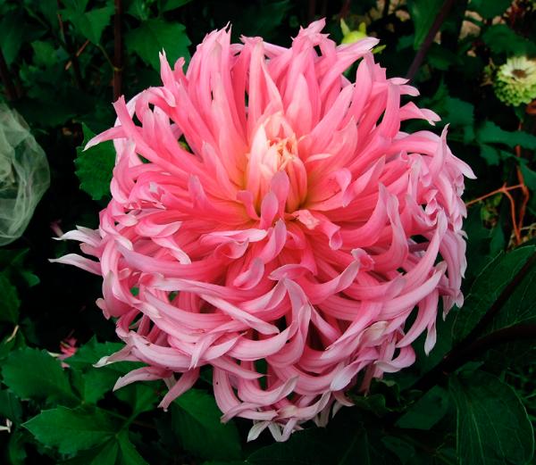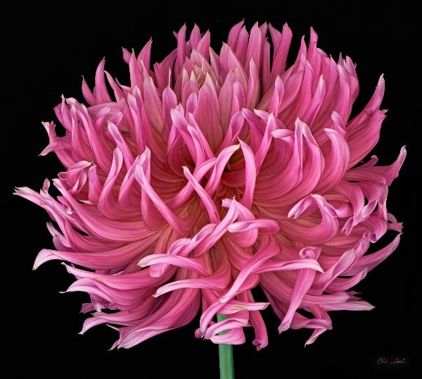 the incurved cactus flowers is a very pleasing dark pink. As it matures the ray florets swirl